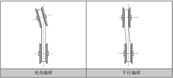 當主,從動輪軸線平行,但兩帶輪不在同一平面上時,引發(fā)平行偏移現(xiàn)象。當兩輪軸線不平行時即為夾角式偏移。